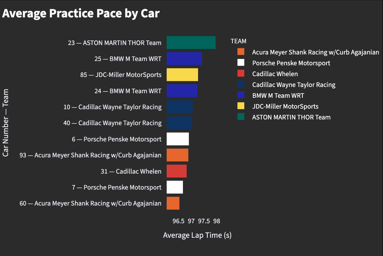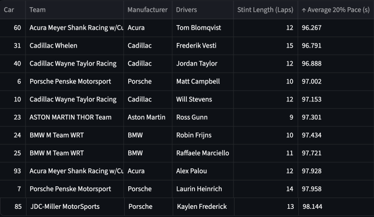 Tom Blomqvist's 12-lap stint, set in the first session, had an average laptime of 1:36.267, over half a second quicker than Fred Vesti's stint in the #31 Action Express Cadillac, which had initially taken pole until a technical infringement put them to the rear of the GTP field for the start.