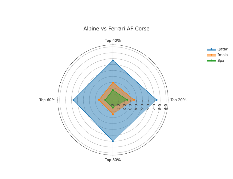 While Alpine were consistent across the metrics at Qatar, they gained on Ferrari in traffic-affected laps at Imola. It was the same deal at Spa, gaining around 0.1% in pace when comparing 20% and 80%.