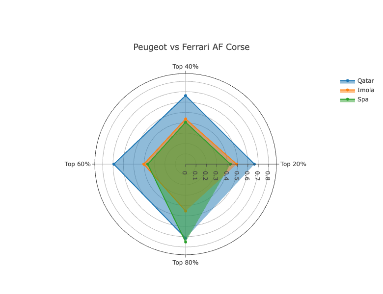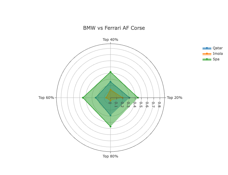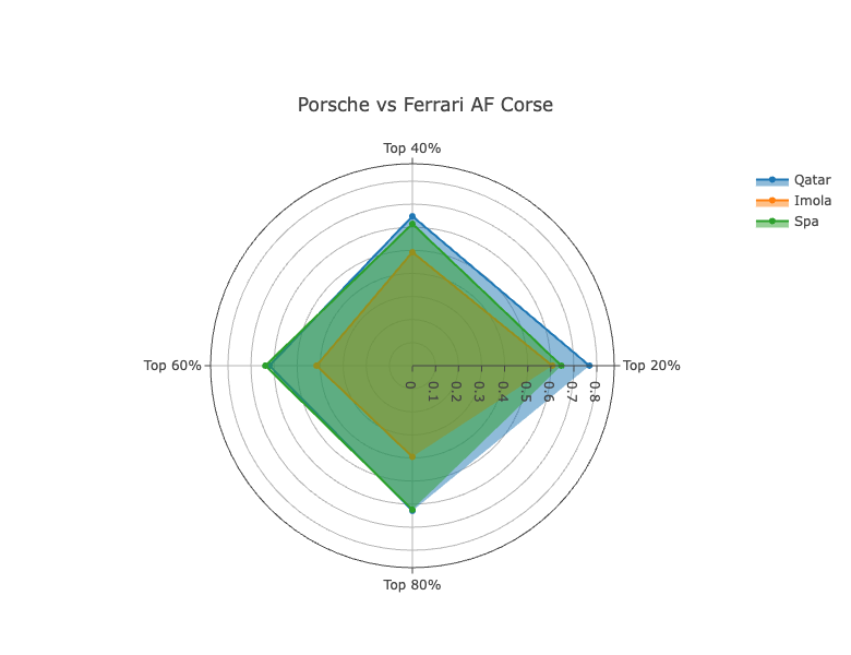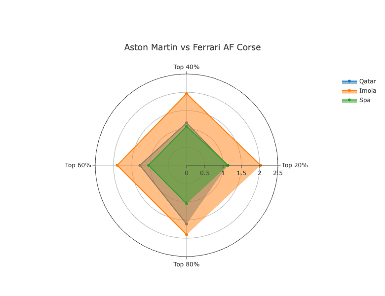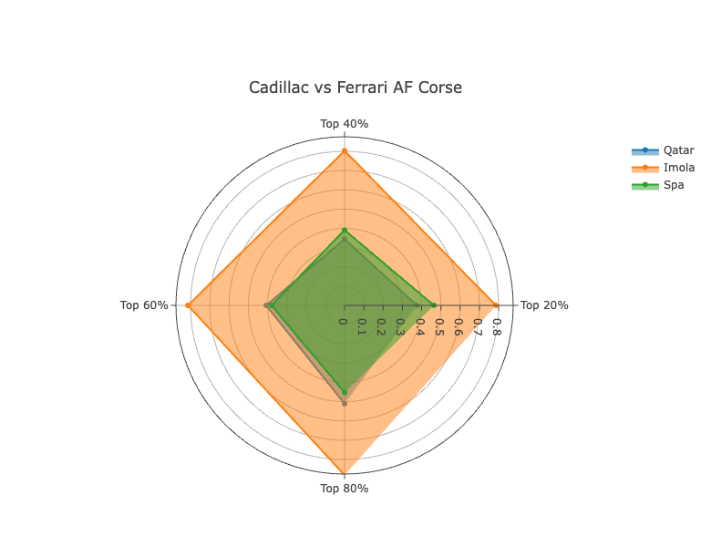 In terms of the metrics themselves, at Qatar and Spa, the team were fairly consistent across all four, not losing that much time to Ferrari in traffic. At Imola, though, they gained quite a bit on Ferrari as laps became more heavily affected by slower cars. In the 80% metric they were just 0.047% off Ferrari, compared to ultimate pace being 0.195% away.
