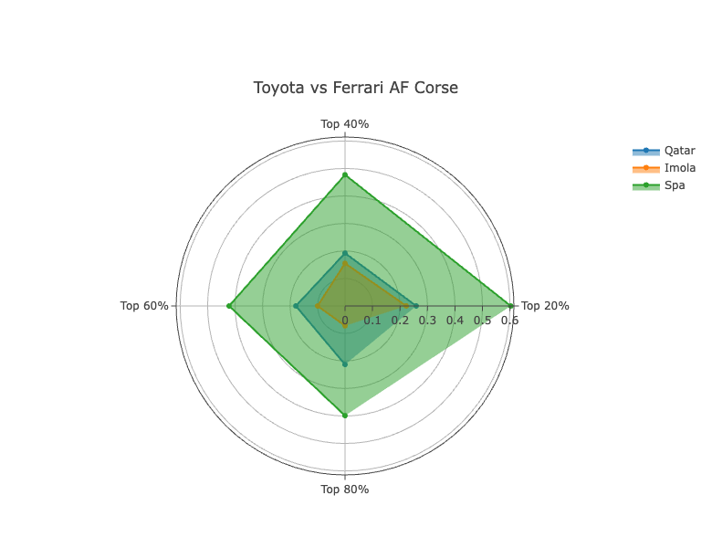 Toyota closed up significantly to Ferrari at Imola, behind only BMW. They were also much better in traffic at the narrow-but-fast Italian circuit, where they gained considerably on Ferrari when you look at their 20% compared to 80%.