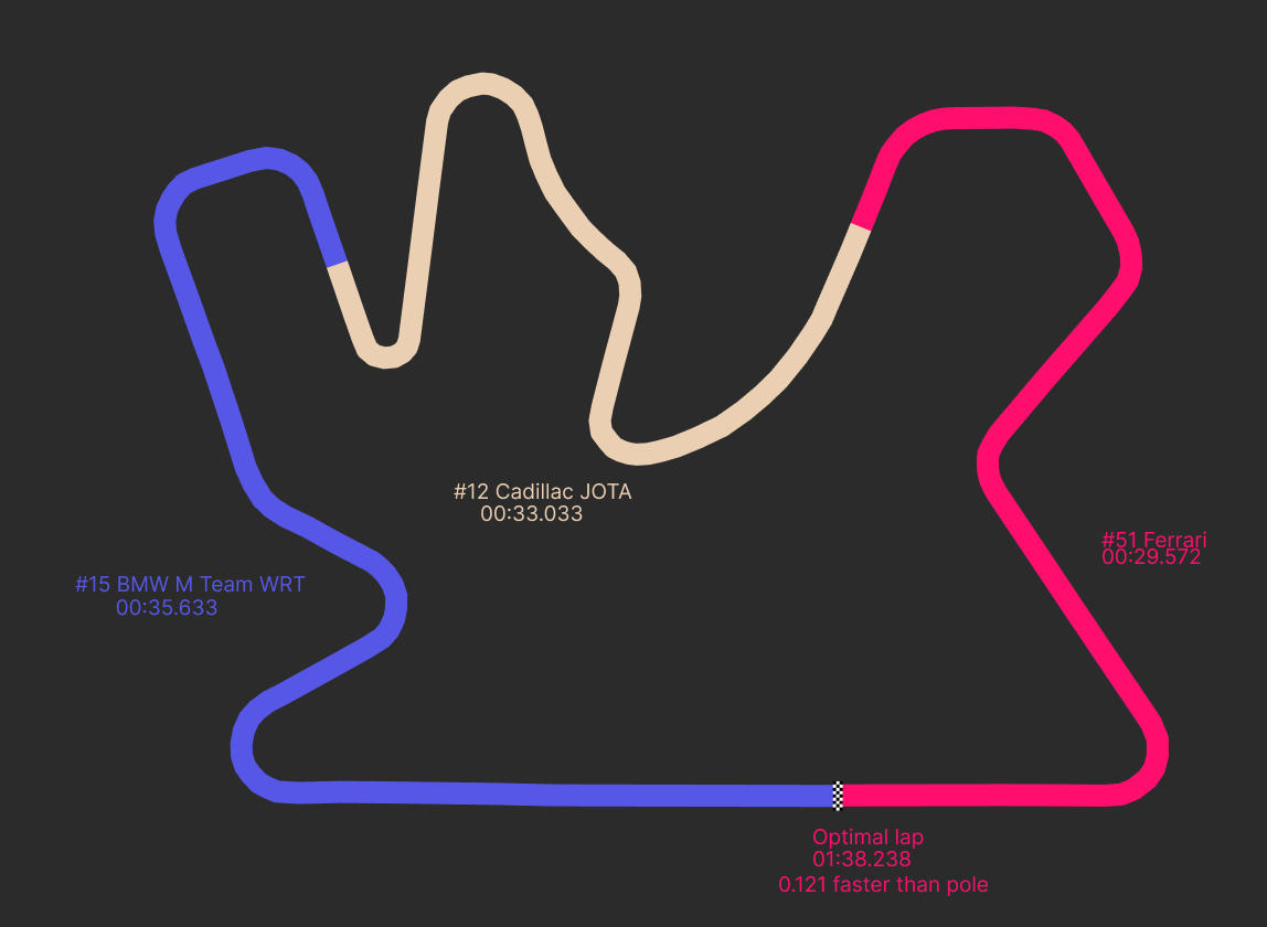 As you can see from the track map above — I'm no designer, you can probably tell — D. Vanthoor was quickest in sector 1 in the all-important Hyperpole session. Giovinazzi was 0.072 off here, with his teammate and countryman Antonio Fuoco, in the sister #50 car, in-between, 0.031 off the BMW driver.