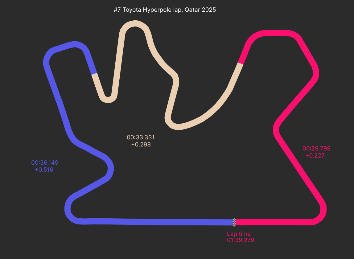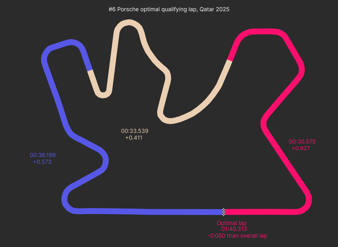 Well, it's hard to say. There's no obvious place where either were losing time in qualifying... it seems they are just lacking pace at Lusail. Take a look at the diagrams below. We've taken the #6 Porsche's best qualifying sectors, and the #7 Toyota's Hyperpole sectors, to try and form a picture around this.