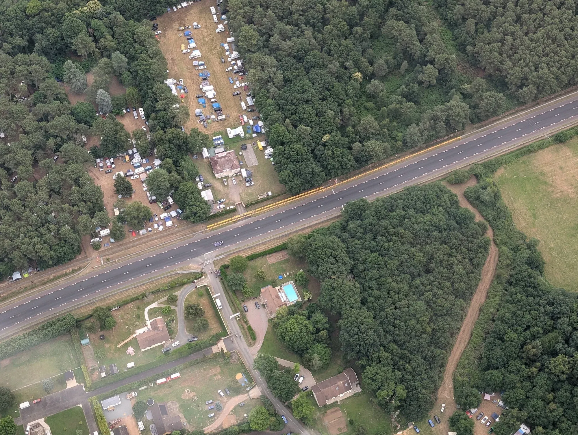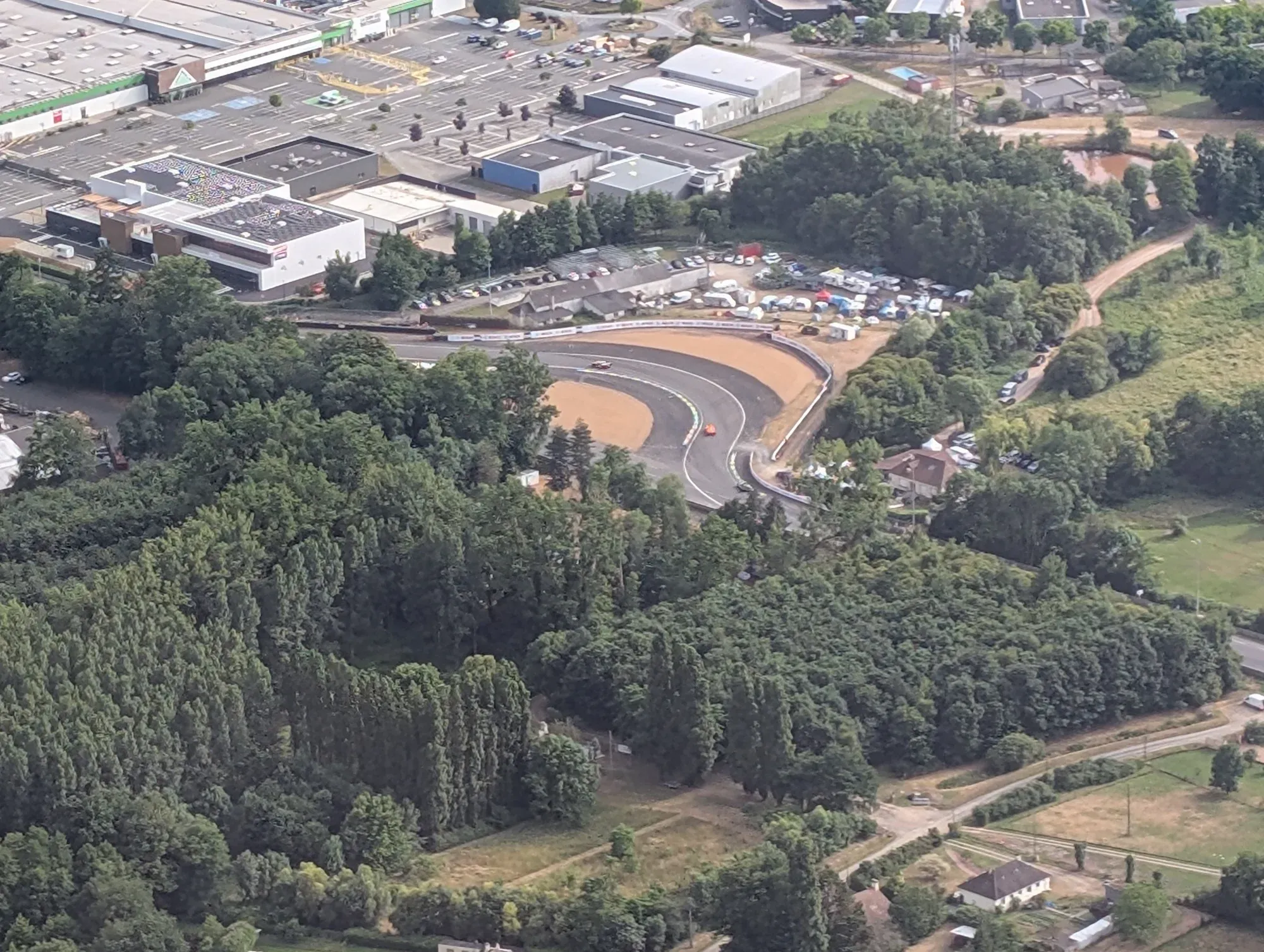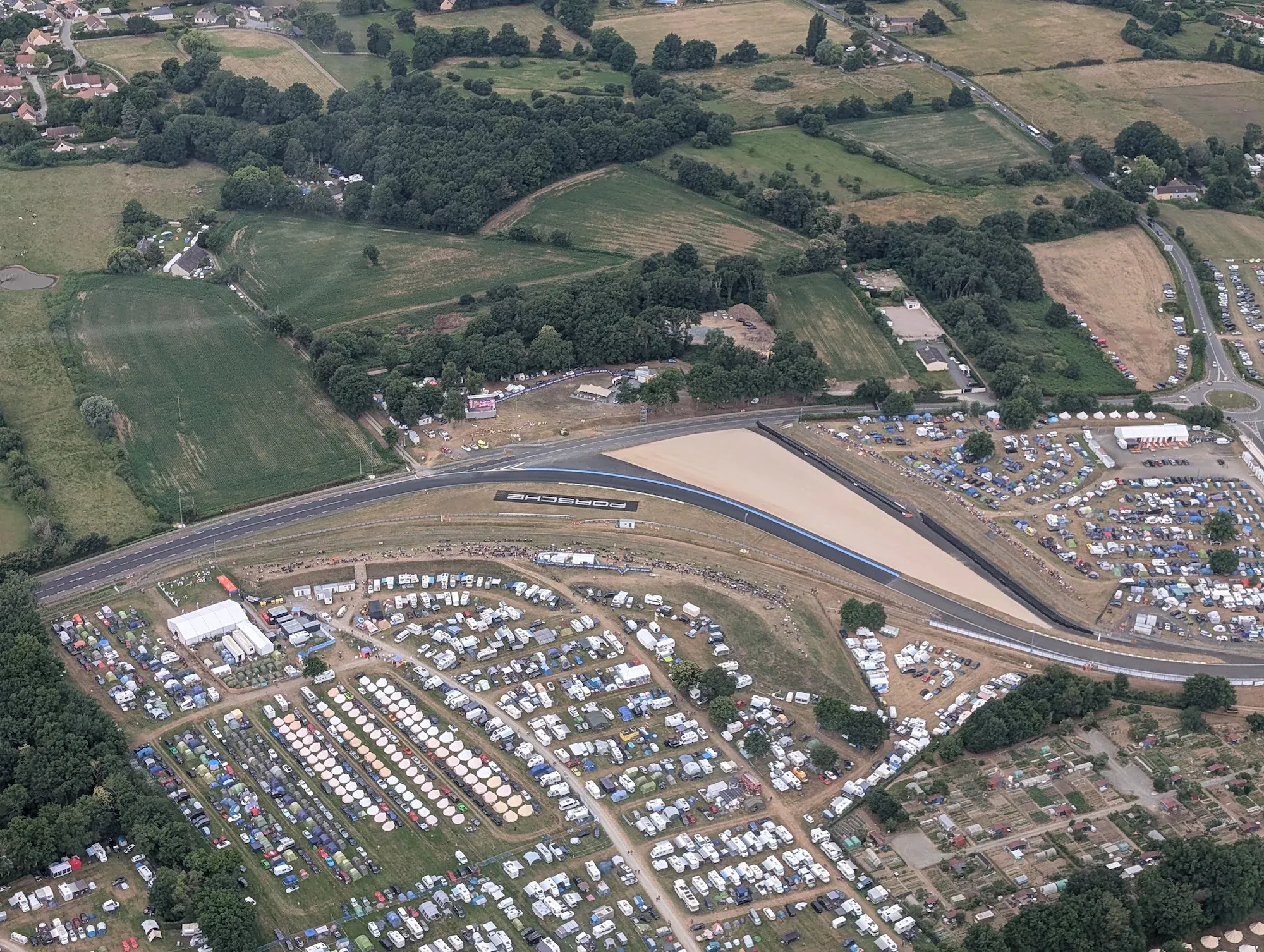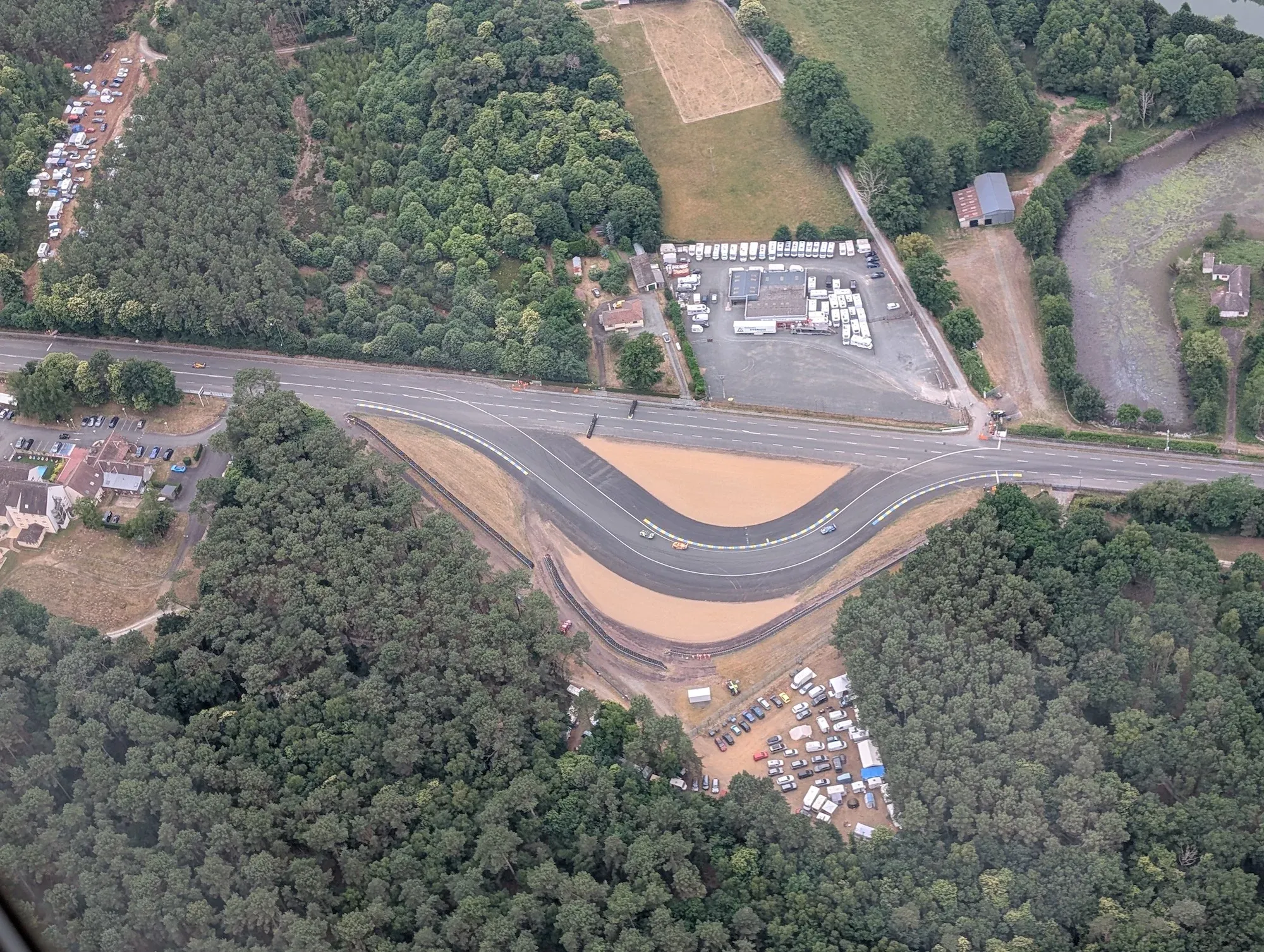 Indianapolis corner. Hi Goodyear!Porsche Curves, my personal favourite section of track.Another shot of Porsche Curves, showing the Beausejour campsite.Did you know there's a Silverstone-shaped lake in the middle of the circuit? Neither did we.A wider shot of Porsche Curves, showing the kart track as well.You can clearly see public road heading under the track here at Porsche Curves.The run off area, at the top of the image to drivers' left, was added a few years ago.The Ford Chicane and pit entry.It was very cool to see the racing from above - not our usual vantage point!Which cars can you see?