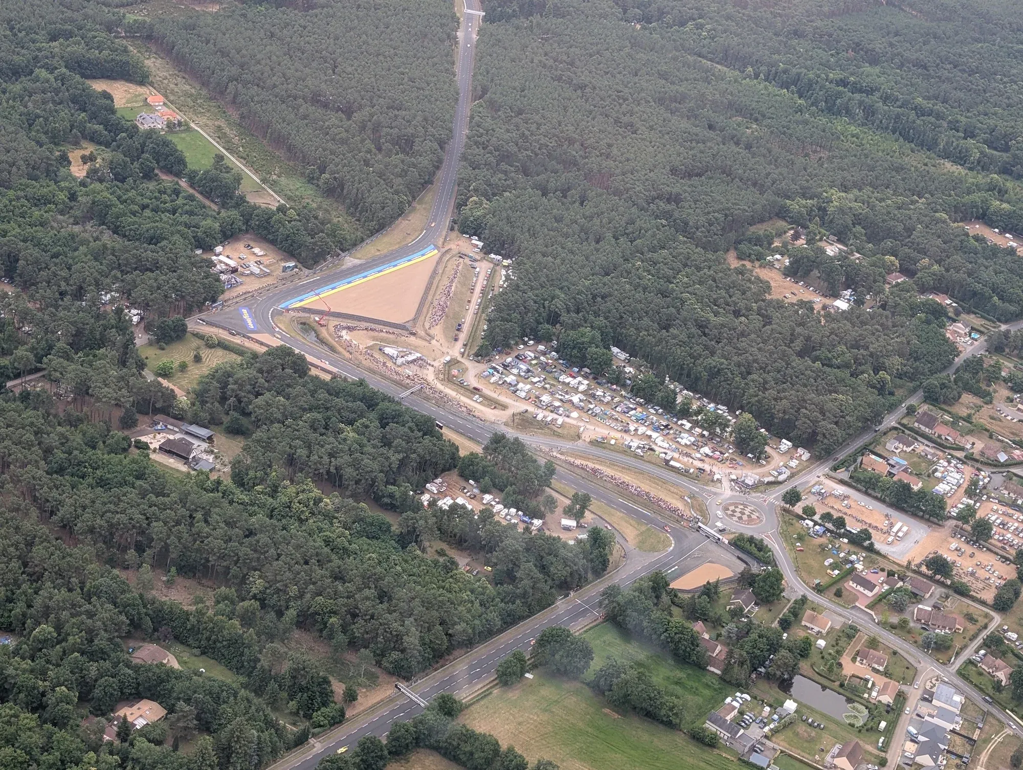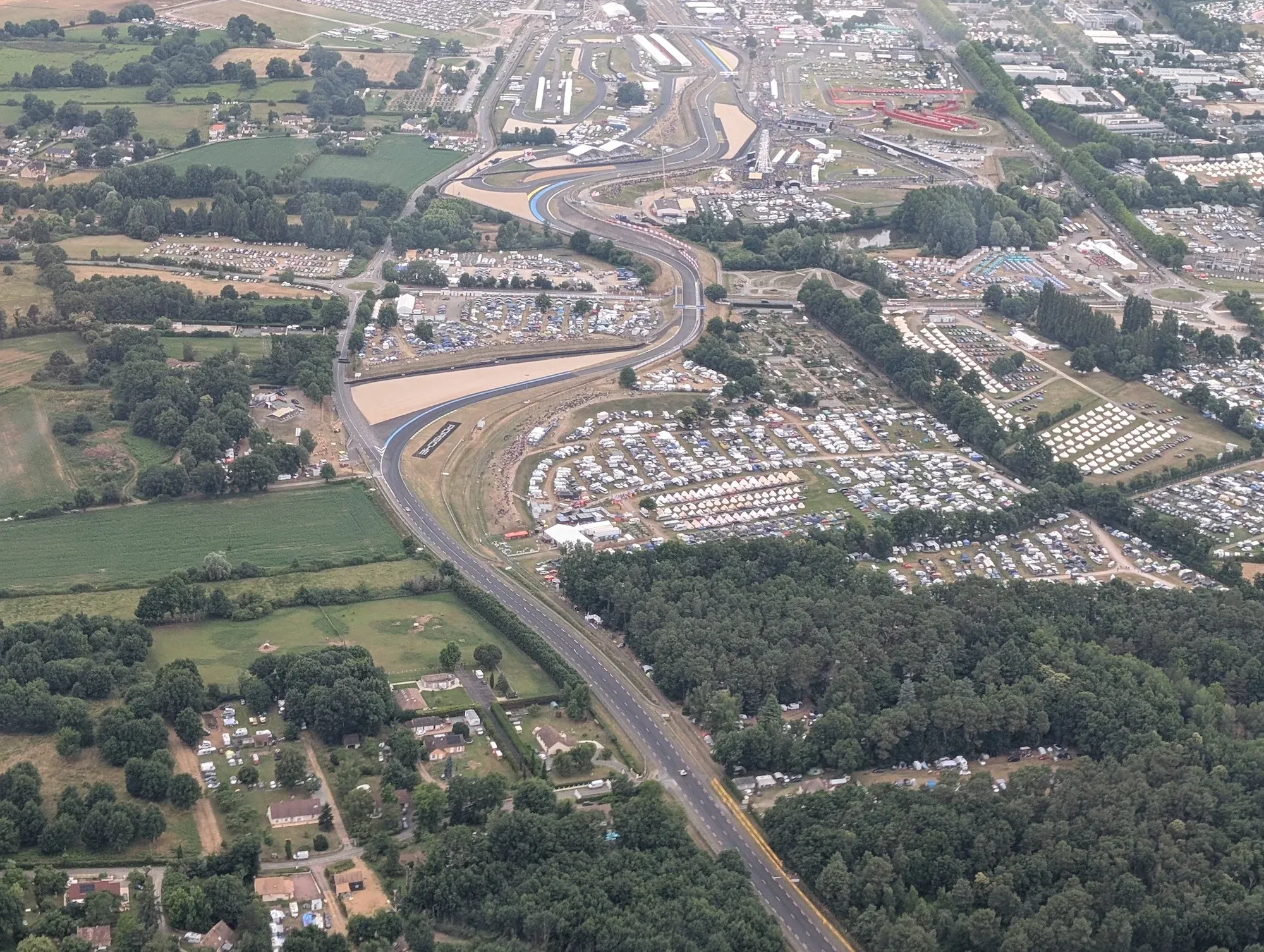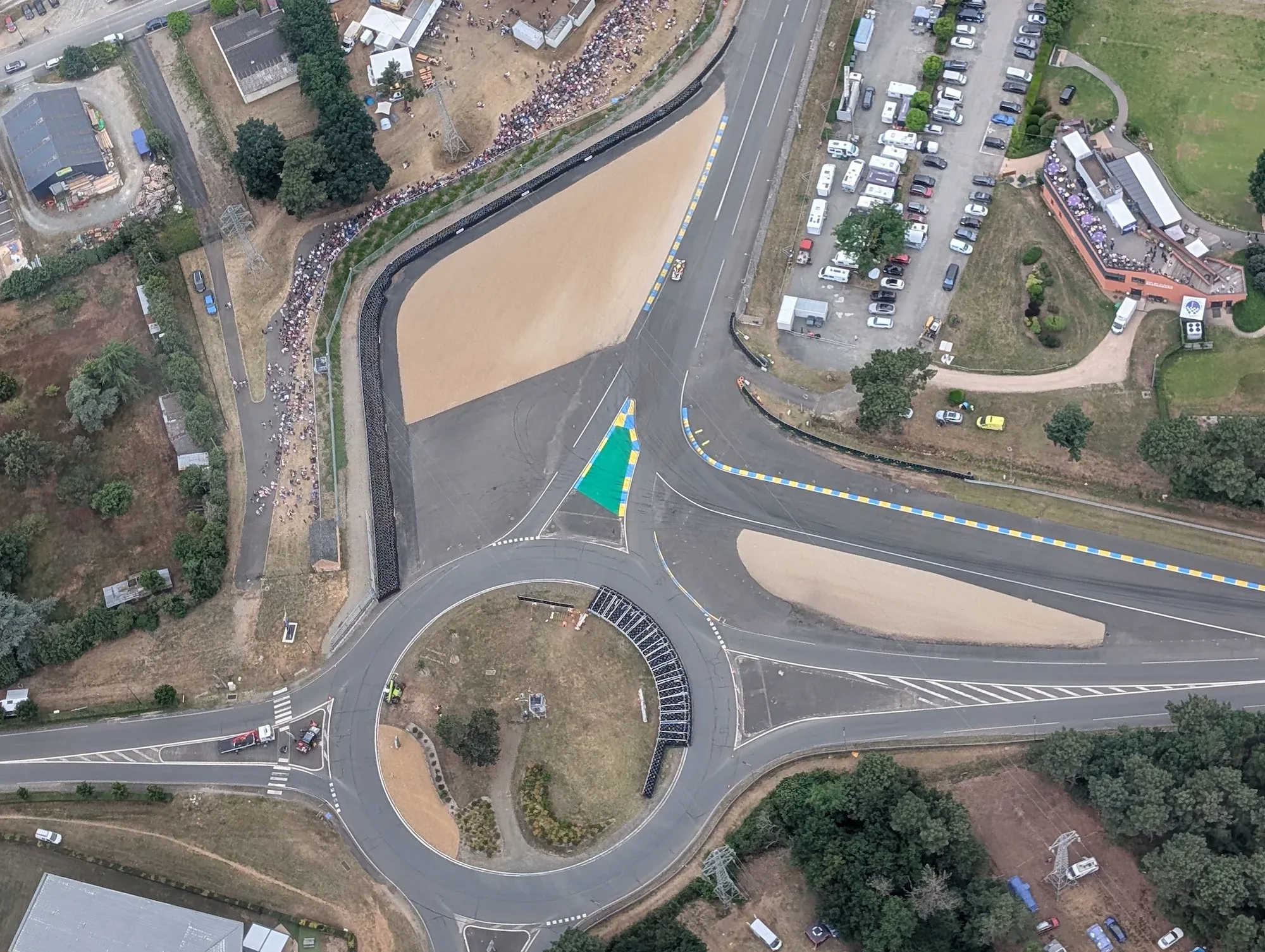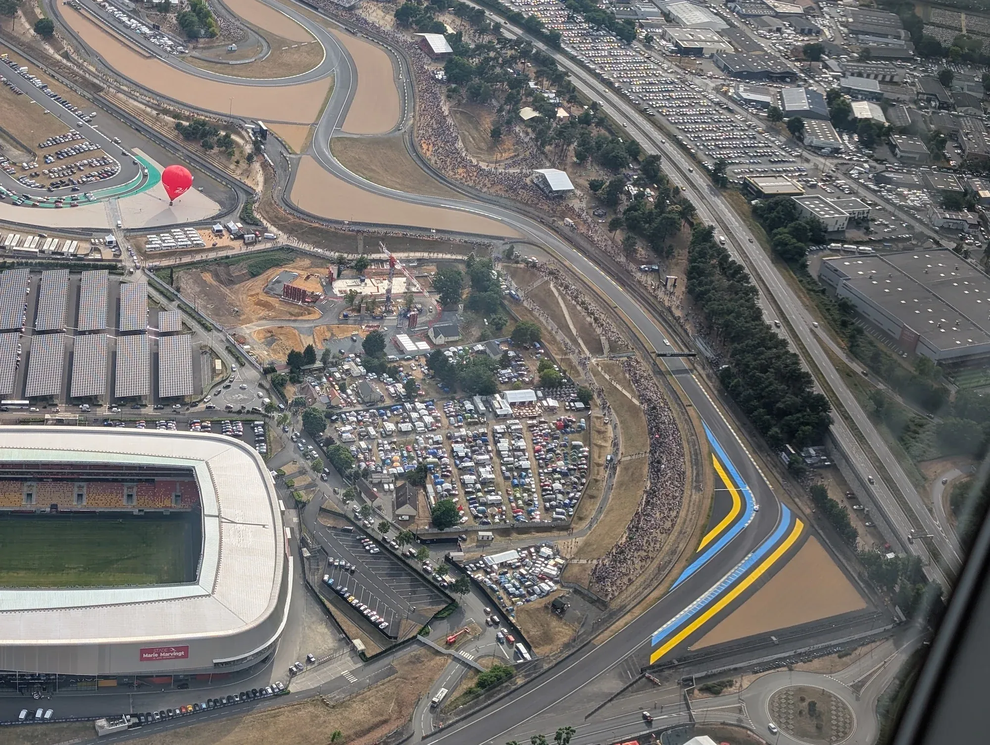 The Blimp ride really showed the scale of the track.The Marie-Marvingt stadium, where the ACO press conference is held every year.Want a go?The first chicane, rechristened 'Daytona chicane' after IMSA and ACO's partnership.The Mulsanne Straight, with the kink at the top of the image.The second chicane.A Corvette and McLaren navigate their way through the second chicane.Mulsanne Corner. Hitting the apex is important here, to get a good exit for the long run to Indianapolis.The roundabout at Mulsanne corner.The track stretching off into the distance, taken from Mulsanne corner. The grey area on drivers' right exiting Mulsanne Corner is the old signalling pits, no longer used.The run down to Porsche Curves, approaching the end of the lap.It was incredible to see the track from above.A very wide shot of the track, showing the first sector of the lap to Tertre Rouge.Looking backwards down the track towards Tertre Rouge, roughly above the first chicane.Our trip was over — we waved goodbye to the Blimp, off on another trip for more guests, invited by Goodyear.