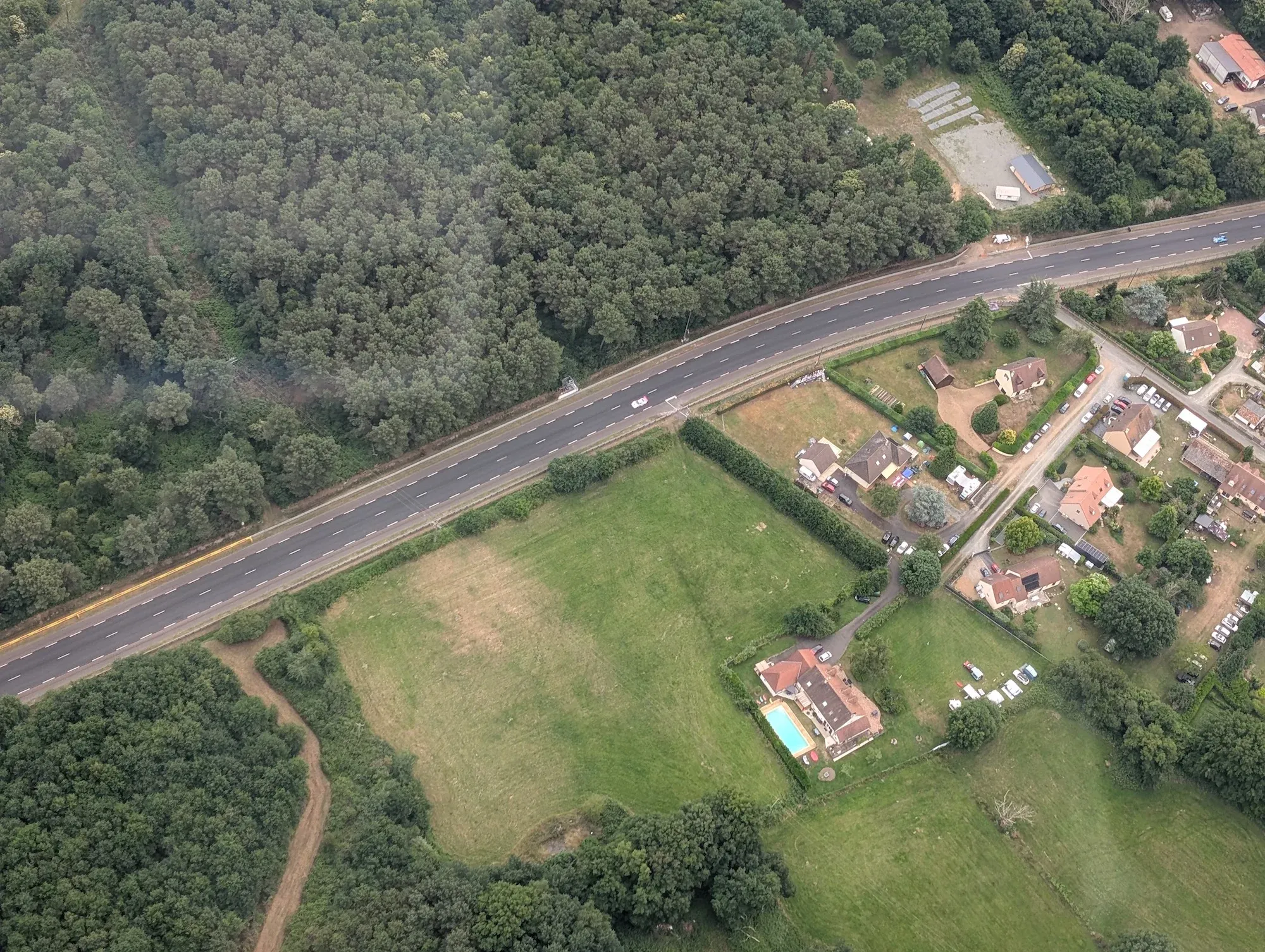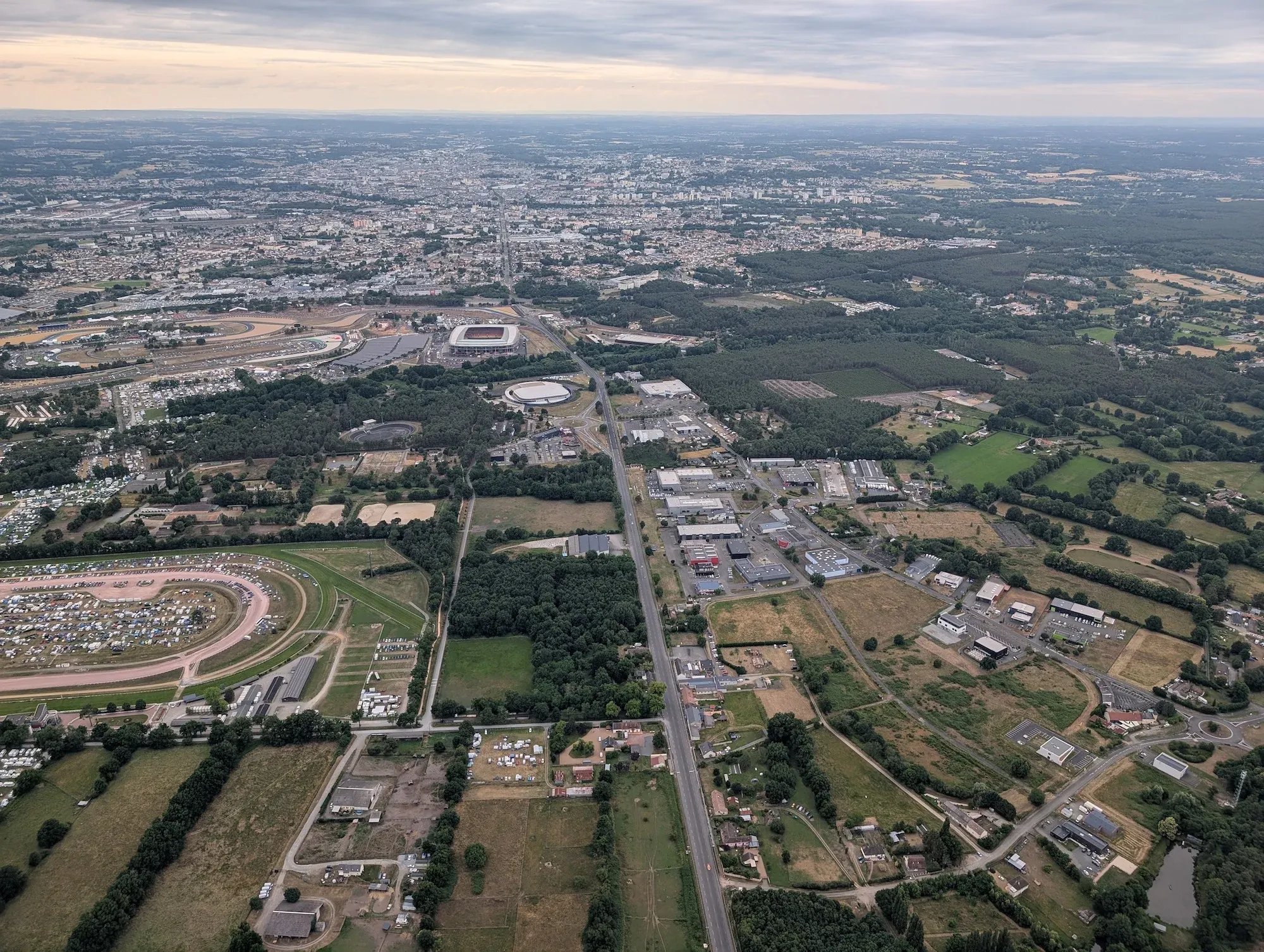 The Blimp takes off for a trip before ours.The French countryside surrounding Le Mans as we flew towards the track.The first chicane of Circuit de la Sarthe.Tertre Rouge corner, with the Marie-Marvingt Stadium to the left.A wide shot of the track with Tertre Rouge to the right and the first chicane to the left.An overhead shot of Tertre Rouge and the Forest Esses.