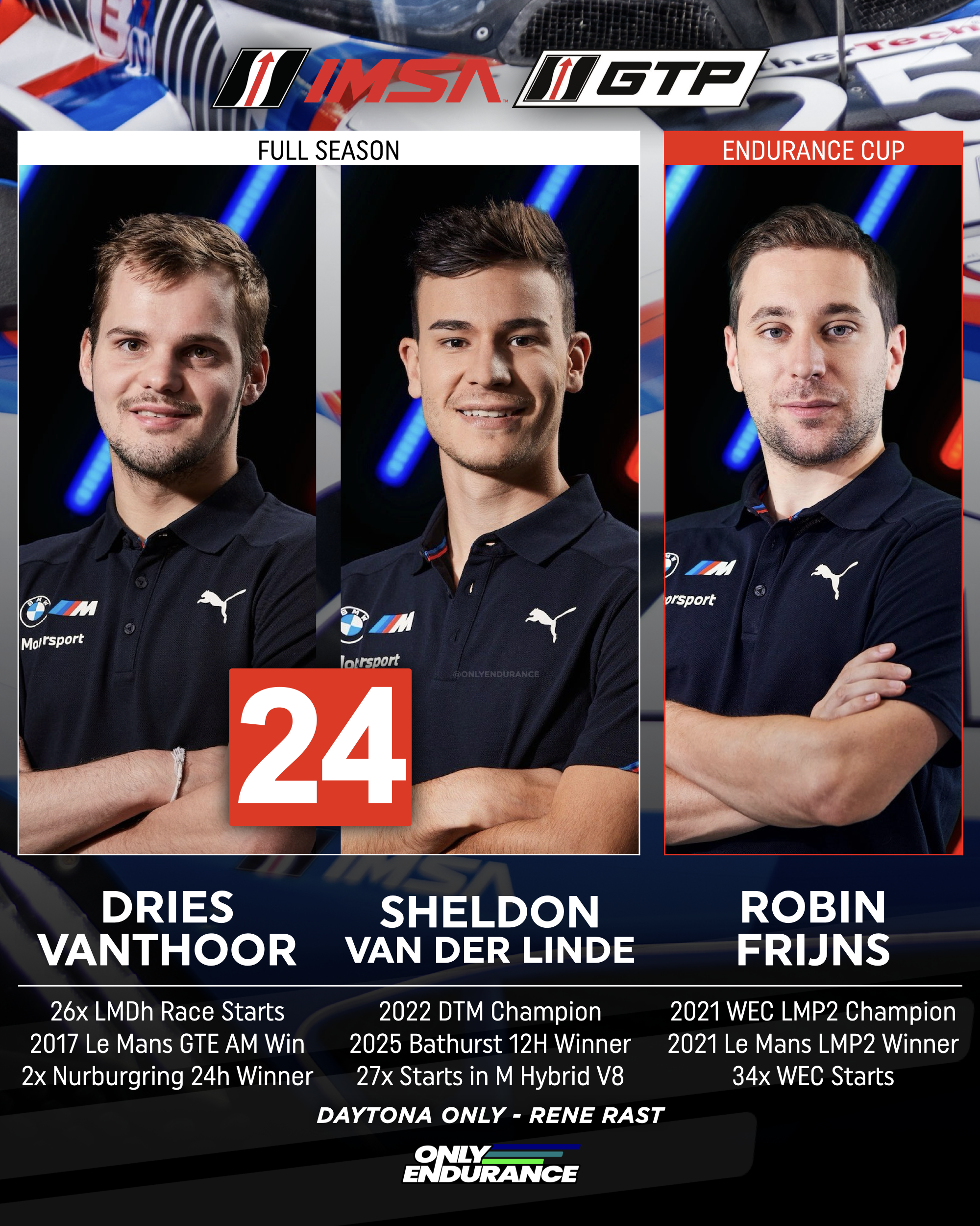 Dries Vanthoor remains in the #24 car, which he pedalled to four consecutive pole positions at the start of 2025, and will be joined by Sheldon van der Linde as the full-season duo – the South African completed his first full IMSA schedule aboard the #25 last year.